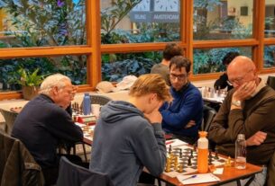 Ikzelf (Martin van Gils) mocht de tweede remise aantekenen. Met zwart aan bord 4 tegen nog altijd 2100+ zat ik de hele tijd tegen een iets mindere stelling aan te kijken. In plaats van lijdzaam af te wachten knalde ik maar eens wat pionnen naar voren, ik verloor daardoor wel de basis van mijn pionnenketen maar lreeg op de andere vleugel genoeg tegenspel. Gezien het verloop van de andere borden wilde mijn tegenstander geen risico’s nemen, met zetherhaling tot gevolg.