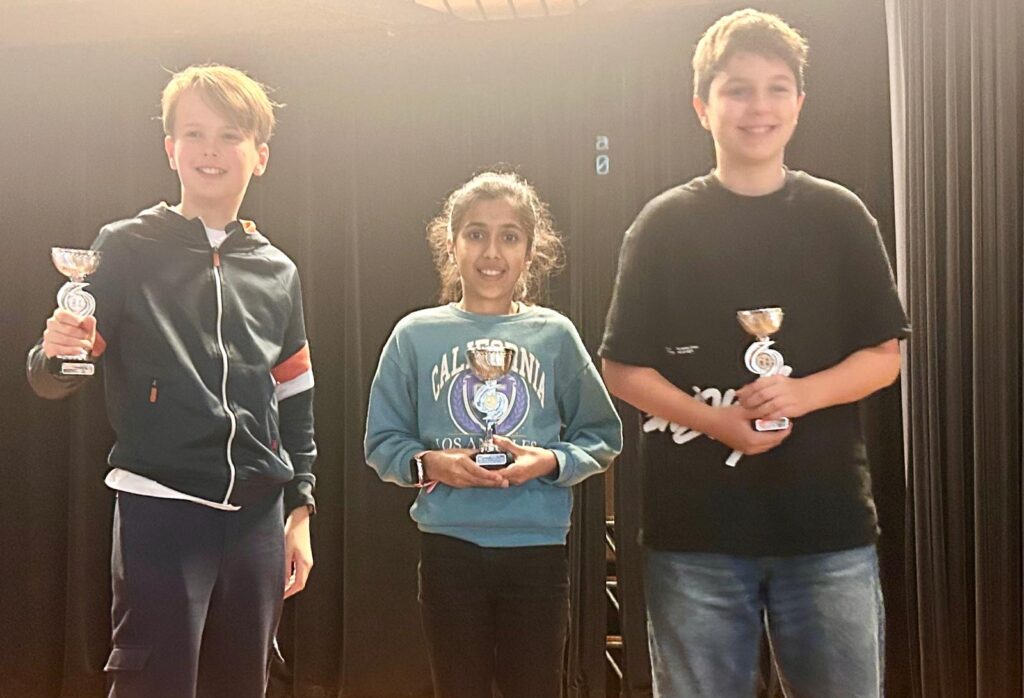 Ik heb nog geen website met uitslagen gevonden, dus mogelijk deden er meer Almeerders mee, maar van enkele ouders heb ik al gehoord dat Aanya, Kavish en Sriharithra in de prijzen zijn gevallen. Aanya werd zelfs eerste met een 100% score, Kavish en Sriharithra ieder 2de met 5 punten.