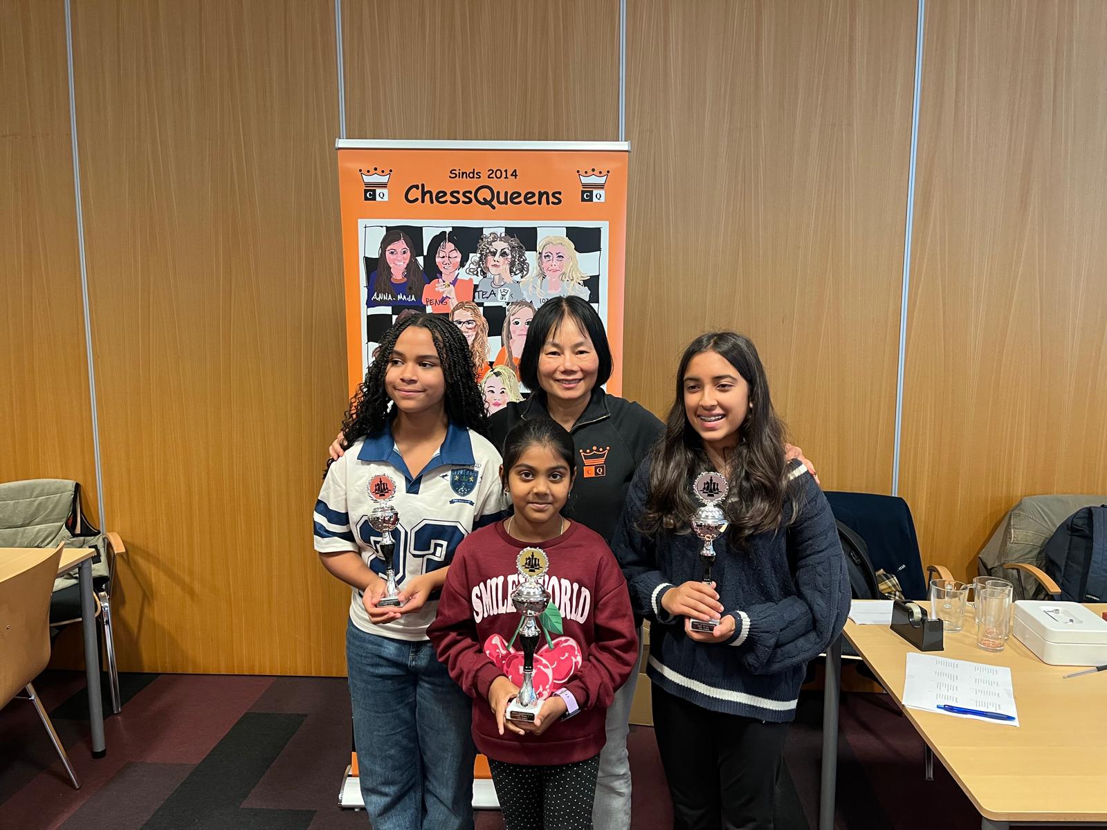 Op de foto is het podium van groep 1 te zien. 3de plaats voor Elisa (MSK), 2de Anika (Zukertort) en 1ste Sriharithra (Almere). Op de achtergrond GM Zhaoqin Peng.