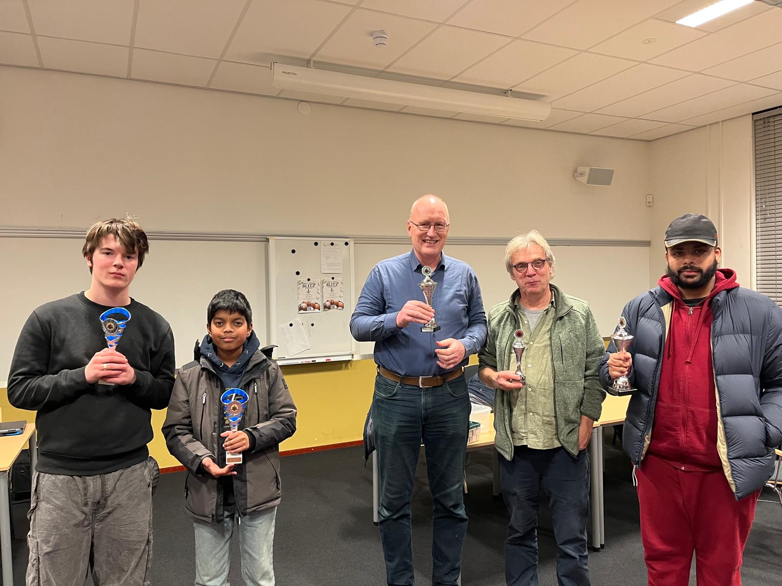 De ABC jeugdcategorie werd voor het tweede jaar op rij gewonnen door Leon. De strijd zou eigenlijk tussen hem en Aahil gaan, maar Aahil was afwezig en dat leverde hem twee 0en op, want hij had al 3 speeldagen gemist. Leon begon de laatste speeldag met een halfje achter op Aahil, en moest minstens 1 punt halen om zeker te zijn van deze jeugdprijs. Hij had twee byes kunnen opnemen, maar dat ligt niet in Leon’s karakter: hij ging er voor spelen. In een spannende pot wist hij in ronde 11 al het benodigde punt te behalen. Een doorgebroken pion meer was uiteindelijk doorslaggevend tegen Leo, een mooie prestatie. Dat er daarna tegen Sacha nog een halfje bij kwam was bonus.