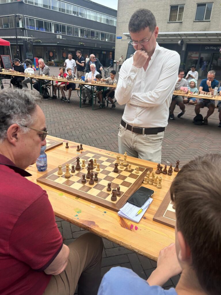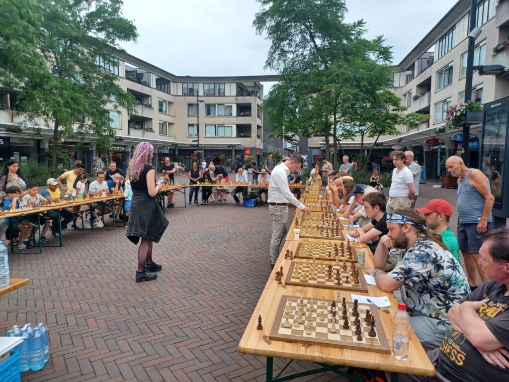 Afgelopen zaterdag is op het Globeplein door GM Erwin l’Ami en IM Jop Delemarre een dubbele simultaandemonstratie gegeven. Beide heren speelden 18 borden, maar doordat er opnieuw aangeschoven kon worden nadat een partij was afgelopen hebben beide heren ruim meer dan 18 partijen gespeeld. De weergoden hielpen mee: hoewel het weerbericht 32 graden en volle zon had voorspeld, rolden precies bij aanvang van de wedstrijd wat wolken voor de zon en kon het hele evenement bij een prettige temperatuur gespeeld worden.