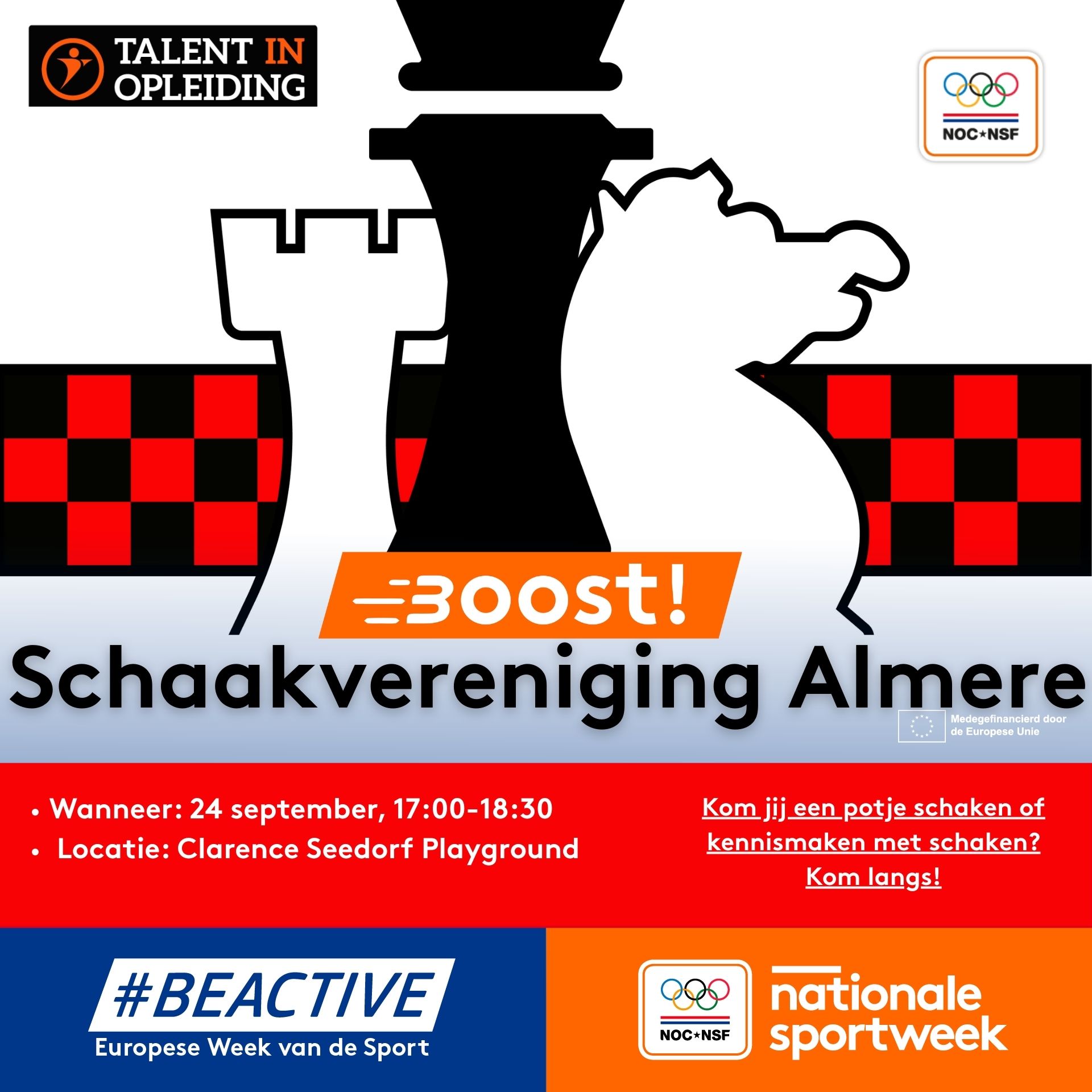Morgen zijn er enkele vertegenwoordigers van de schaakvereniging ter promotie in het kader van de Week van de Sport op de playground bij het Clarence Seedorf plein.