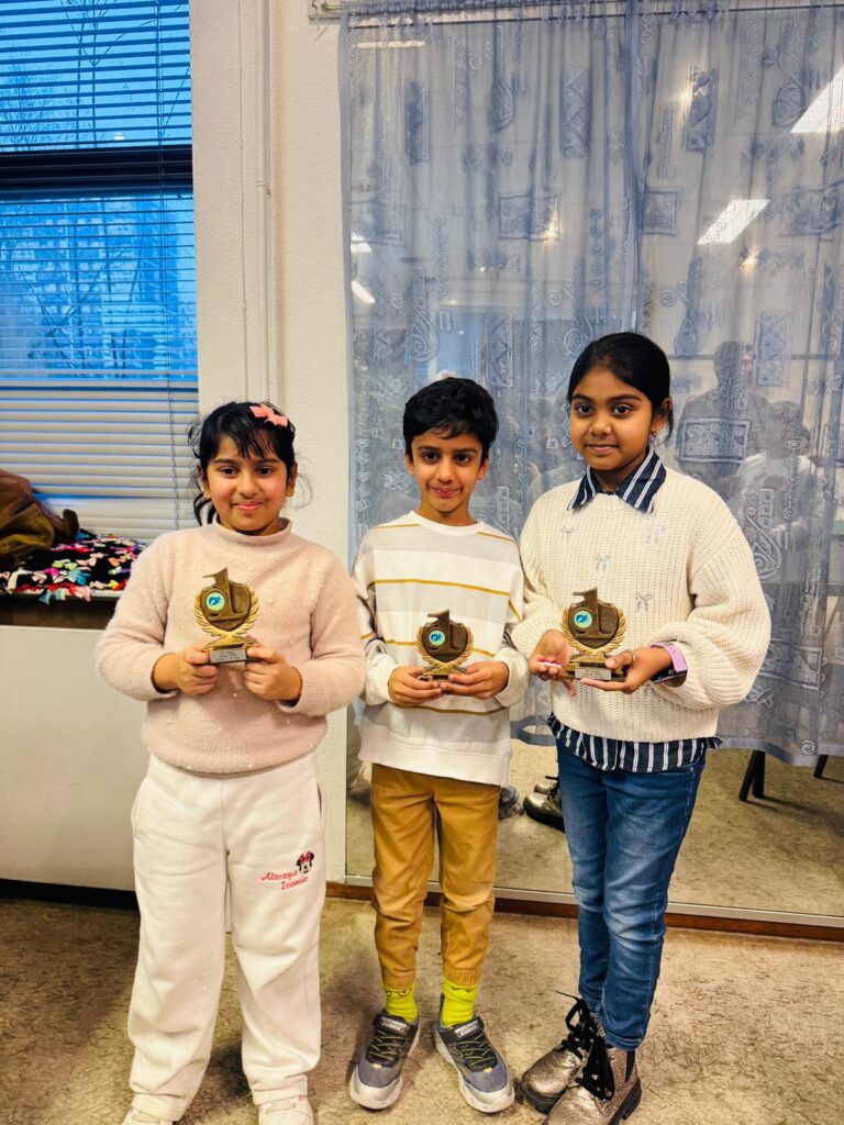 In categorie F zelfs 4 clubgenoten: Aalia, Yuvaansh, Eiden en Devansh. Devansh en Eiden behaalde ieder 2.5 punt. Yuvaansh begon met 2 verlies partijen, maar won daarna 4 van de resterende 5 partijen. Alleen tegen Aalia verloor hij nog. Dat was goed voor een 3de plek. Aalia speelde een top toernooi. 4 keer winst en 2x remise. Een mooie eerste plaats en een TPR van 1500! Op de foto is Aalia (links) te zien met medewinnaars Yuvan en Sriharithra.