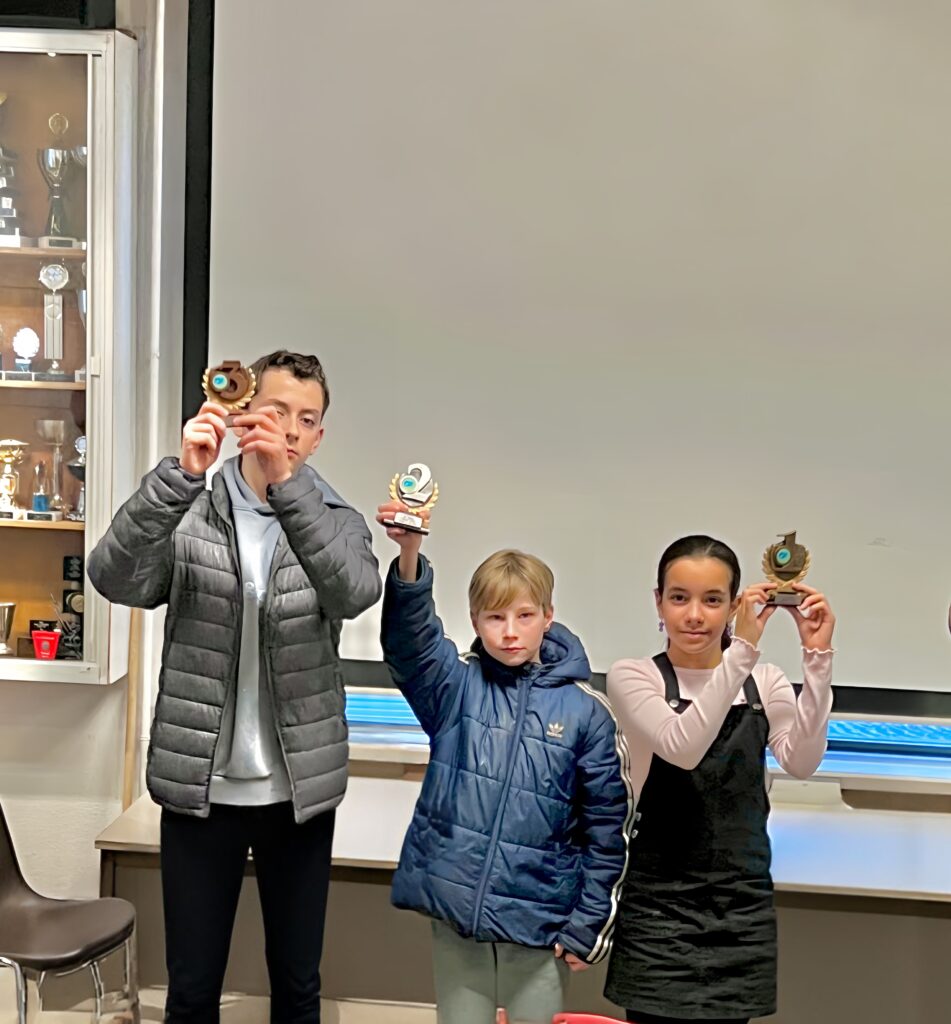 In categorie E hadden we met Alice, Emily en Artem meerdere ijzers in het vuur. Artem behaalde 2 punten. Emily deed het iets beter met 3 punten, al verloor ze wel van Artem. Alice wist de groep te winnen met 4 overwinningen en 2 remises. Een zeer mooie prestatie!