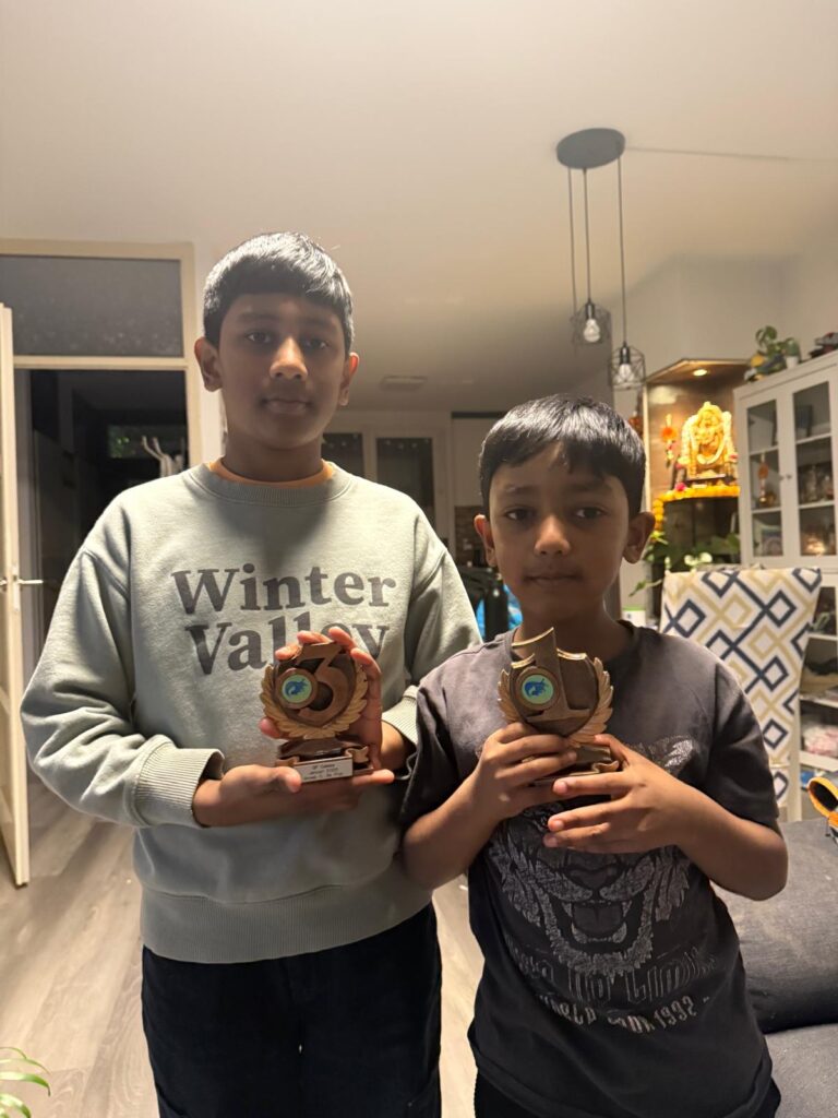 In categorie H ook drie van onze leden die meededen: Reyansh M., Lohith en Suryoday. Suryoday won een partij en speelde twee keer gelijk. Lohith begon ijzersterk met 4 overwinningen, maar in de laatste 3 ronden verloor hij van clubgenoten Eiden en Kavish. Toch een derde plek. Reyansh begon met 4.5 uit 5, maar ook bij hem verliep een ontmoeting met een clubgenoot niet goed: hij verloor van Roman. 5.5 punt zou in mening andere categorie genoeg zijn voor de winst, hier moest Reyansh genoegen nemen met een 2de plaats.